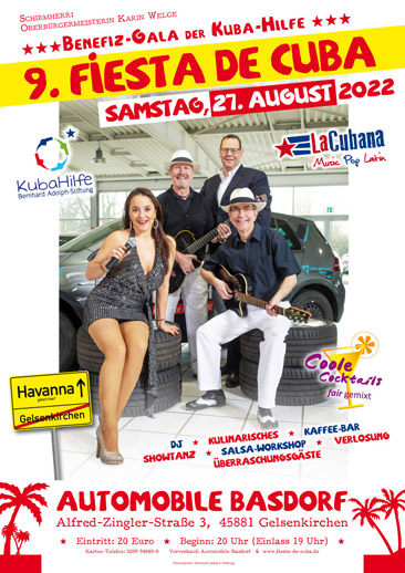 A m Samstag, 27. August 2022 veranstalten die Bernhard Adolph-Stiftung / Kuba Hilfe und Automobile Basdorf bereits zum neunten Mal die Benefizgala "Fiesta de Cuba" und sorgen einmal mehr für einen Hauch von Karibik mitten in Gelsenkirchen.