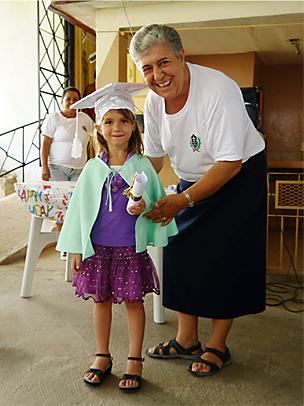 Patenkind Nayelin die Abschlussurkunde. A m 22. Juni 2015 fand in der Kindertagesstätte der Santa Barbara Gemeinde in Párraga die diesjährige Abschlussfeier statt. Etwa ein Drittel der Kinder wechselte damit bestens vorbereitet vom Kindergarten in die Vorschule. Gemeinsam mit den Ordensschwestern und Mitarbeitern des Projekts feierten Kinder und Eltern mit einem abwechslungsreichen Programm den Abschluss. Neben Tanzvorführungen der Kinder bot das Clownpaar Bartolito & Cachirula ein bunt gemischtes Programm aus Gesang, Mitmachspielen und Puppentheater. Nach der Vorführung wurde allen zukünftigen Vorschülern feierlich eine Abschlussurkunde erreicht.