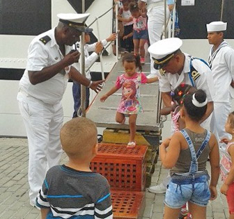 Auf dem Programm stand auch der Besuch der "Maqueta de la Habana", eine besondere Attraktion, die das Modell von Havannas Altstadt darstellt. Ganz besonders wurde es aber erst beim Besuch des Hafens, wo es immer auch große Kreuzschiffe aus aller Welt zu bestaunen gibt. Denn das venezolanische Schulschiff, Simón Bolivár, hatte Kurs auf Kuba genommen und war gerade in der kubanischen Hauptstadt angekommen. Beim Anblick des prachtvollen Dreimasters waren die Kinder kaum noch zu halten, so dass sich die Verantwortlichen entschlossen, nachzufragen, ob man das Schiff besichtigen könnte. Kapitän Ramon Antonio Costero war begeistert von der Idee, so dass nachdem ein Polizist die Gruppe über die Straße geleitet hatte, die Kinder an Bord gebeten wurden, um ihnen die Arbeit und das Leben auf einem Segelschiff ein wenig zu erklären. So wurde den Kindern für einen Moment die Möglichkeit gegeben, sich wie kleine Piraten aus ihren beliebten Zeichentrickfilmen zu fühlen.