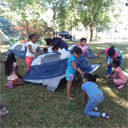 Das Zeltlager hatte zusätzlich ein ganz eigenes Programm und damit einiges für die teilnehmende Gruppe zu bieten. Es begann mit dem Aufbau, der von der Kuba-Hilfe im Rahmen der Zusammenarbeit mit dem botanischen Garten angeschafften Zelte. Nach einem Abendessen wurden Videos zu Umweltthemen gezeigt, die die Kinder mit großem Interesse, entsprechend ihres Alters, reflektierten.
